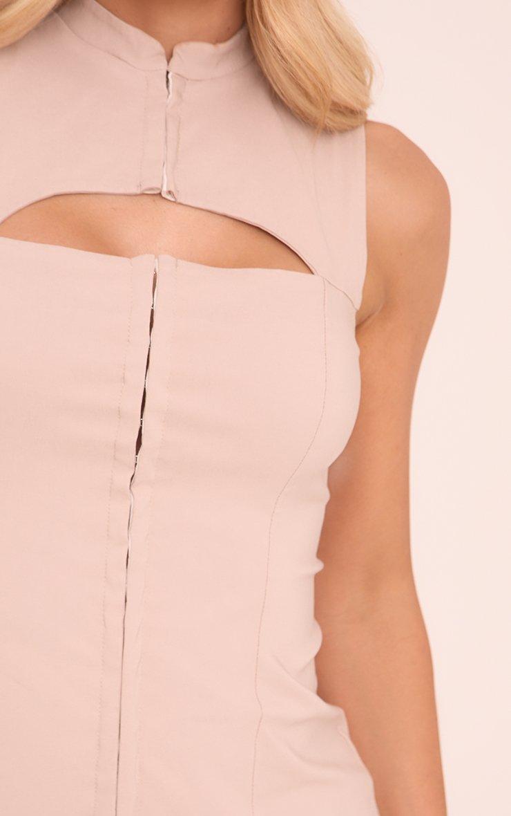 High Neck Slash Front Zip Up Sleeveless Mini Bodycon Dress In Stone
