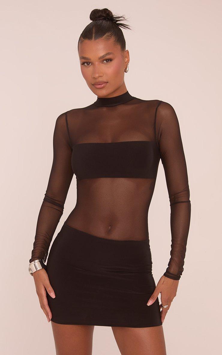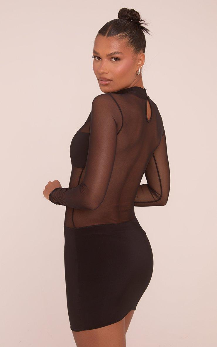 Long Sleeve High Neck Slinky Panel Mini Bodycon Dress In Black Mesh