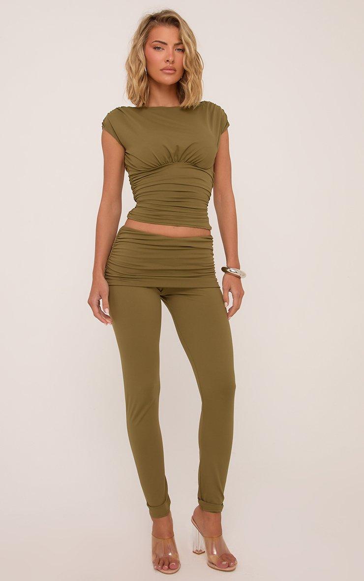 Day or night, our Low Rise Ruched Fold Over Leggings In Green are your new fave fit! These low-rise fold over leggings feature flattering ruched details and a rich khaki tone for a chic and comfy fit. Style these low-rise leggings with the matching top for instant outfit envy!