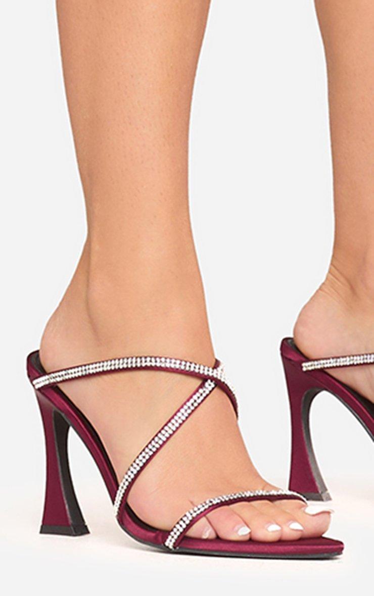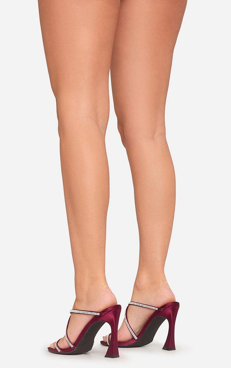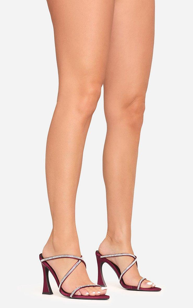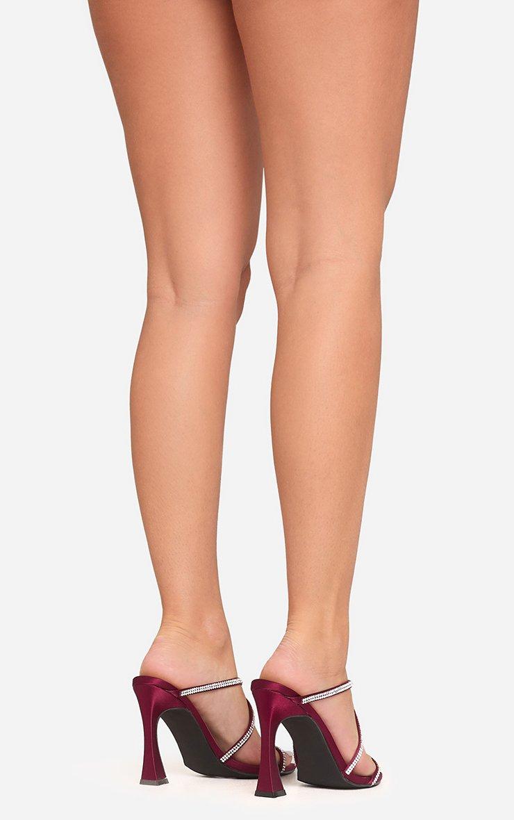 Step into ultimate glam with our Sequel Diamante Cross Strap Detail Flared Heel Mule in Burgundy Satin! These burgundy satin heels boast a diamante cross strap design for sparkly sass, while the flared heel and mule style ensure all night dancing. Perfect bold looks, these diamante heels are guaranteed to make you the centre of attention!