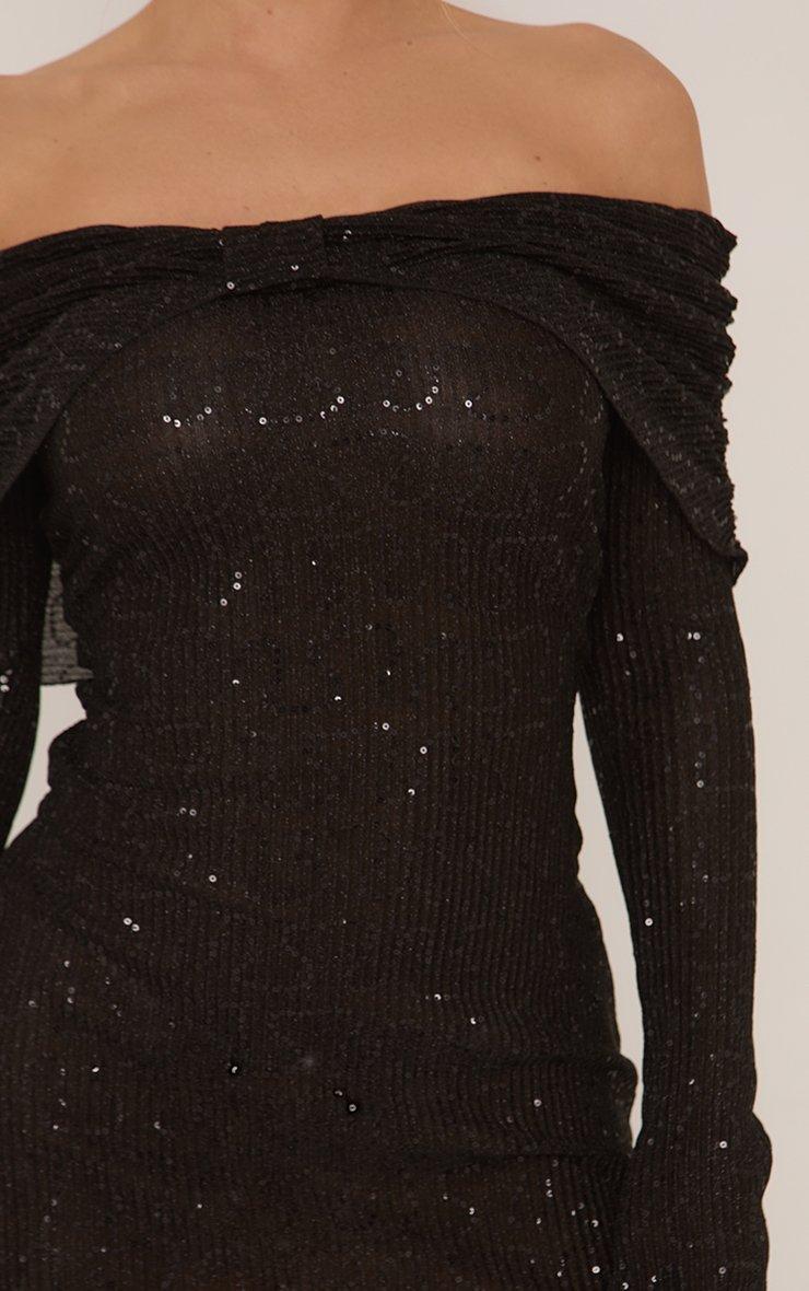 Bow Bardot Long Sleeve Mini Bodycon Dress In Black Textured Glitter