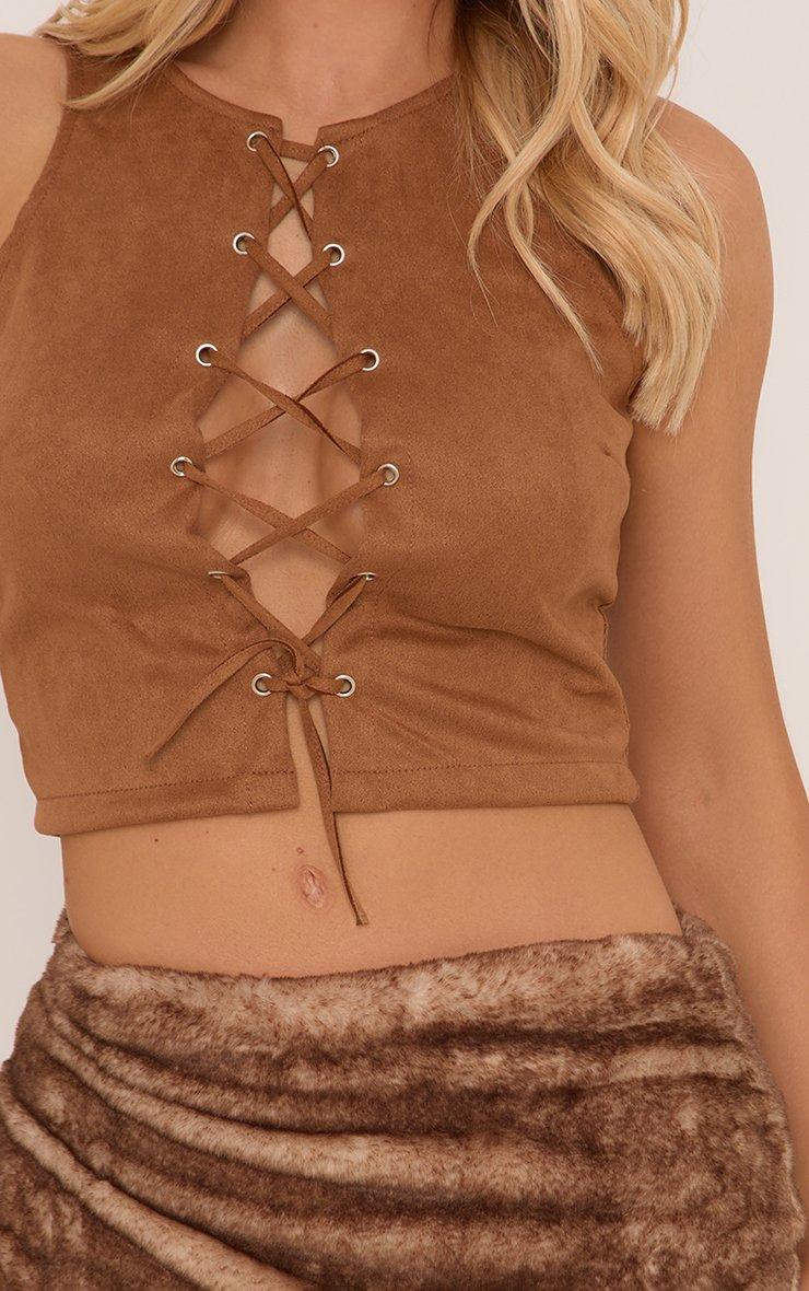 Sleeveless Lace Up Top In Camel Brown Faux Suede