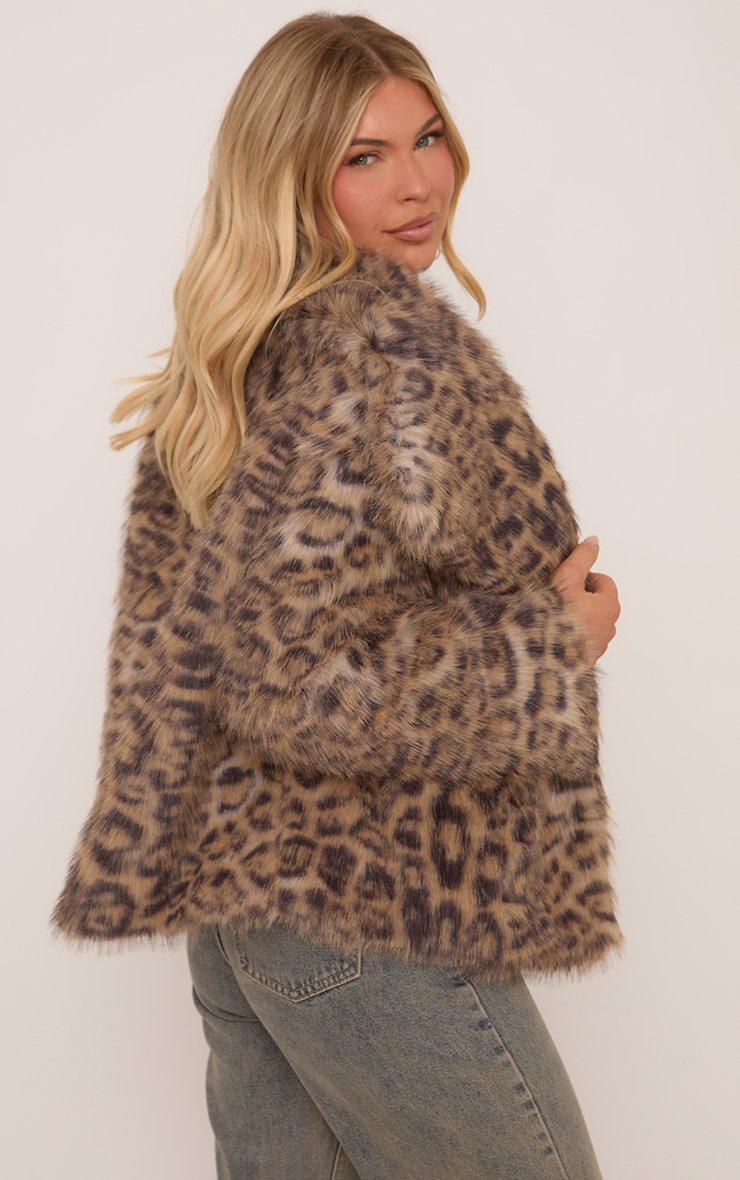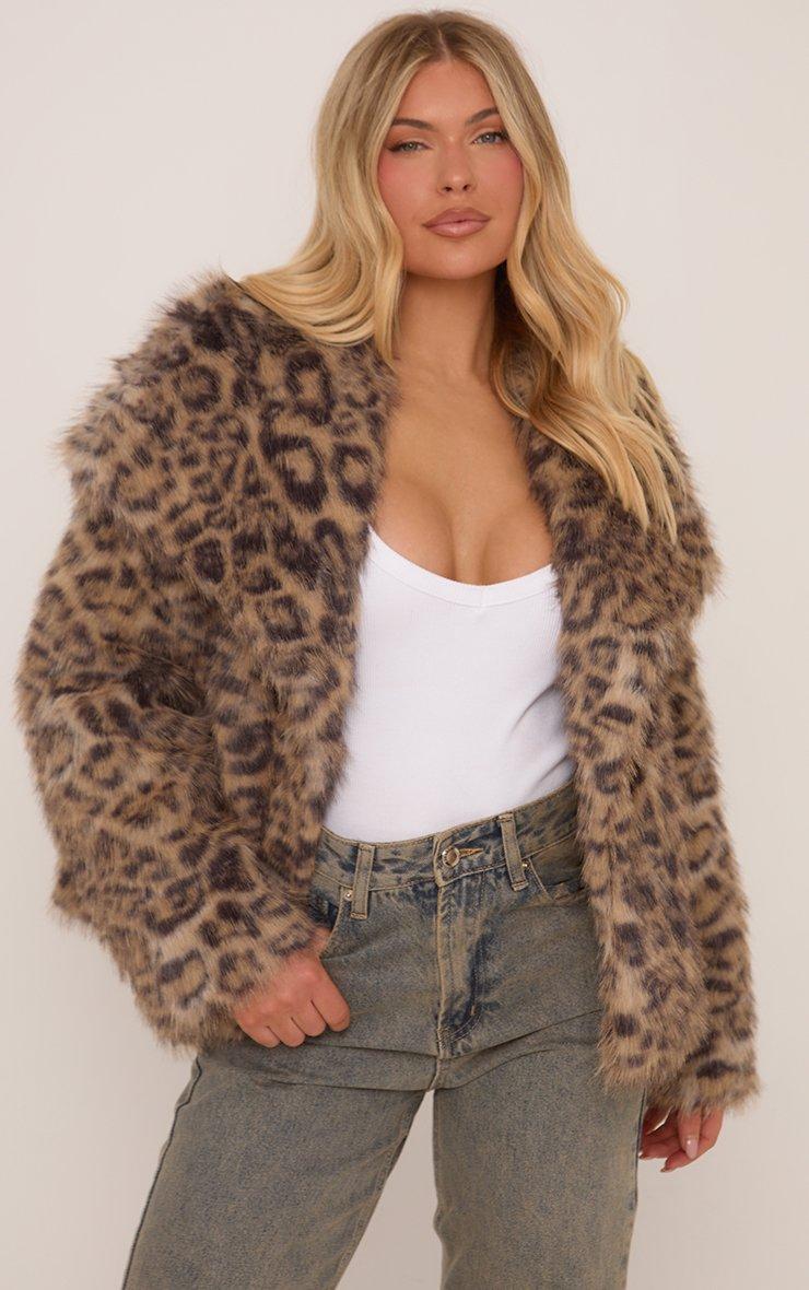 Oversized Collar Coat In Stone Leopard Print Faux Fur