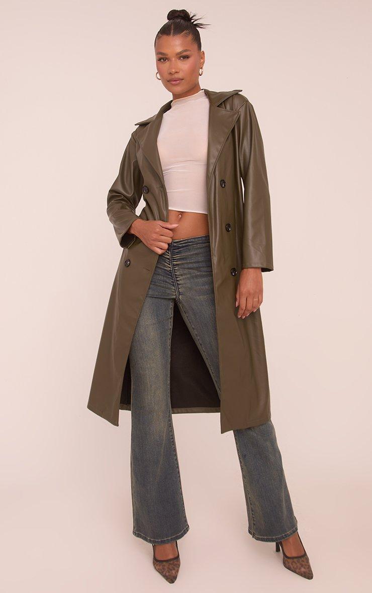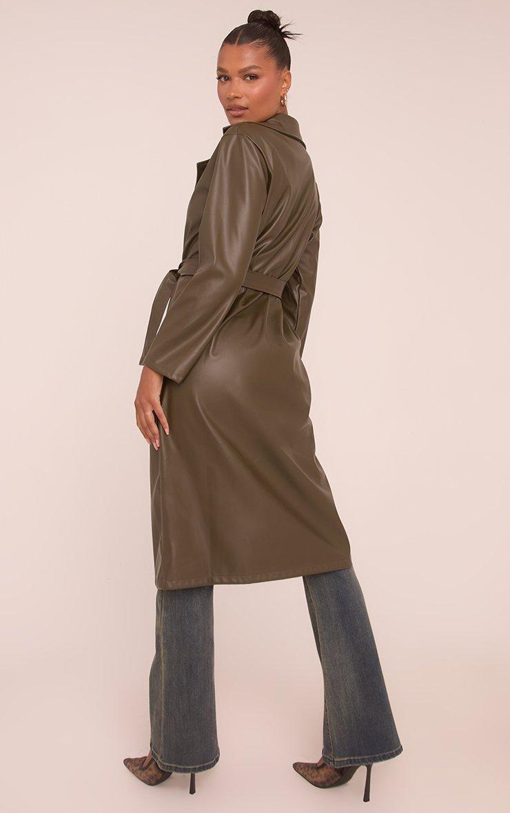 Step up your outerwear game with this Belted Trench Coat in Dark Green Faux Leather. This green faux leather trench coat is your new season obsession with its dark green tone and cinching belted style. Whether you're dressing up for a night out or leveling up your day-to-day look, this trench coat has your back.