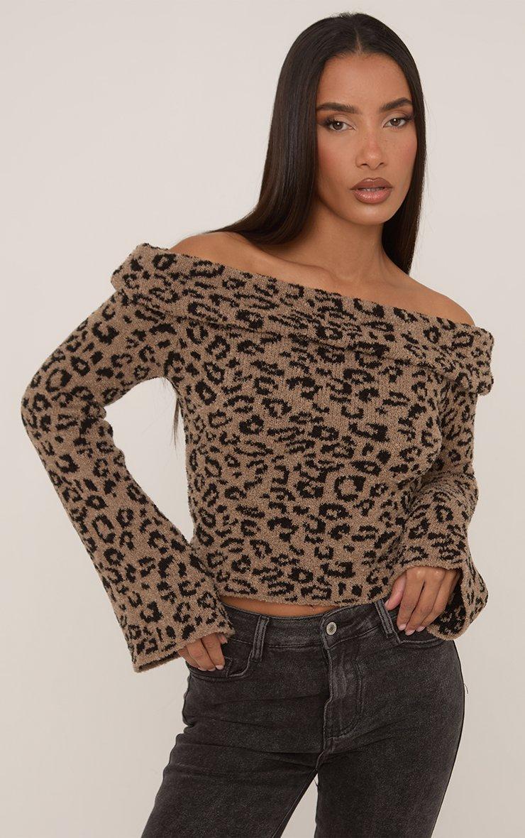 Steal the spotlight in our Bardot Long Sleeve Jumper In Brown Leopard Print Boucle Knit. This leopard print knit jumper is snug and stylish with its chic bardot neckline and cosy boucle knit. Style this long sleeve jumper with jeans and heels for a fierce, day-to-night look.