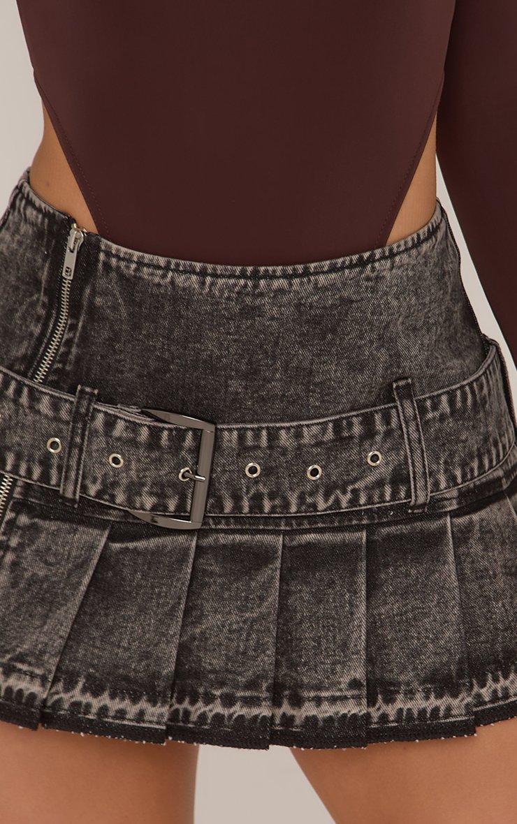Low Rise Belt Detail Pleated Mini Skirt In Washed Black Denim
