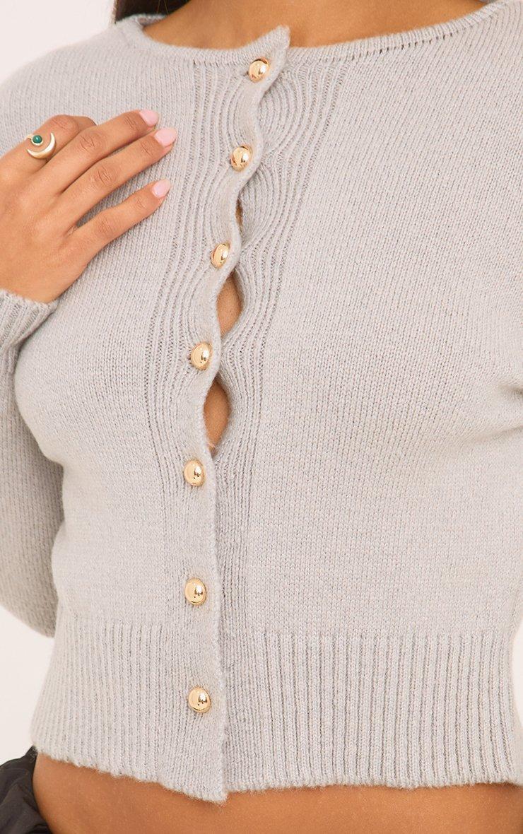 Gold Button Detail Cropped Cardigan In Light Grey Fluffy Knit