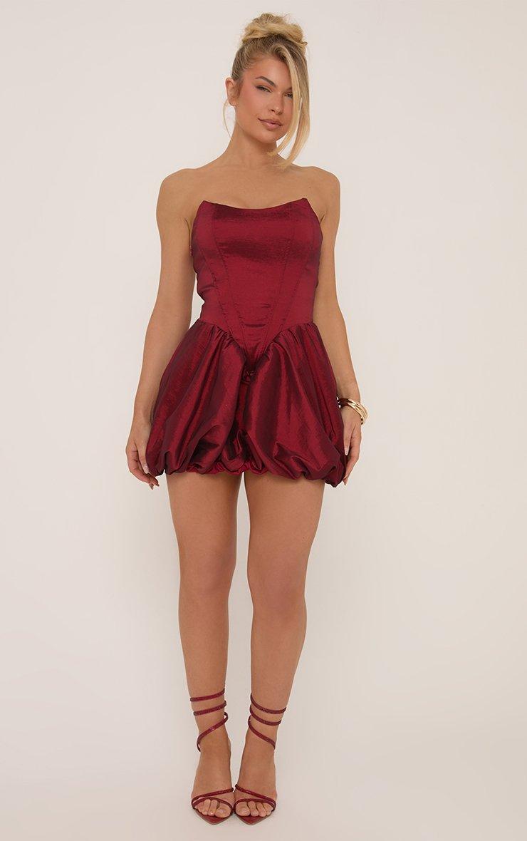 Bandeau Structured Corset Puffball Mini Dress In Burgundy Satin