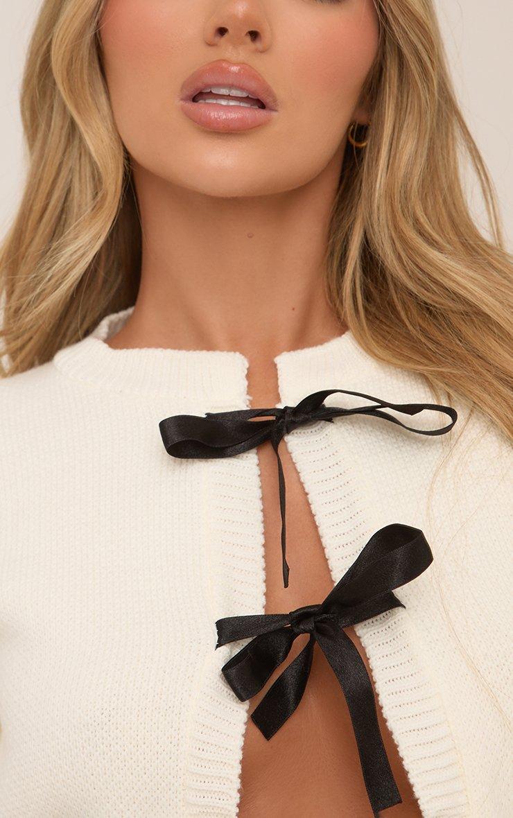 Perfect for layering or rocking solo, this white knit cardigan features a cute bow front detail and cropped design. A stylish staple for when you want to keep it chic and effortless, doll.