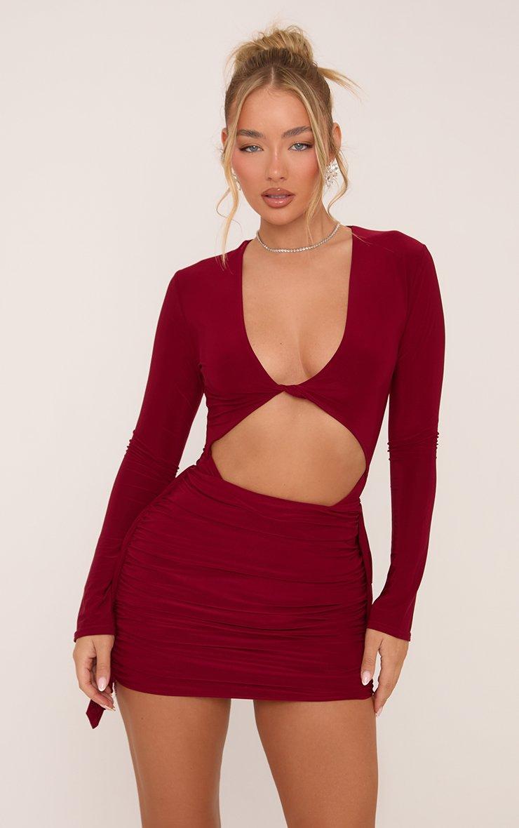 Long Sleeve Plunge Neck Cut Out Front Bodysuit In Burgundy Slinky