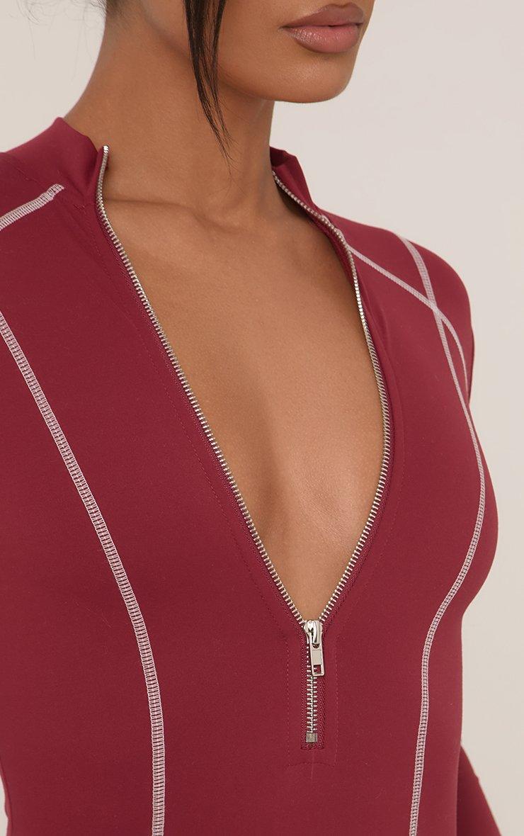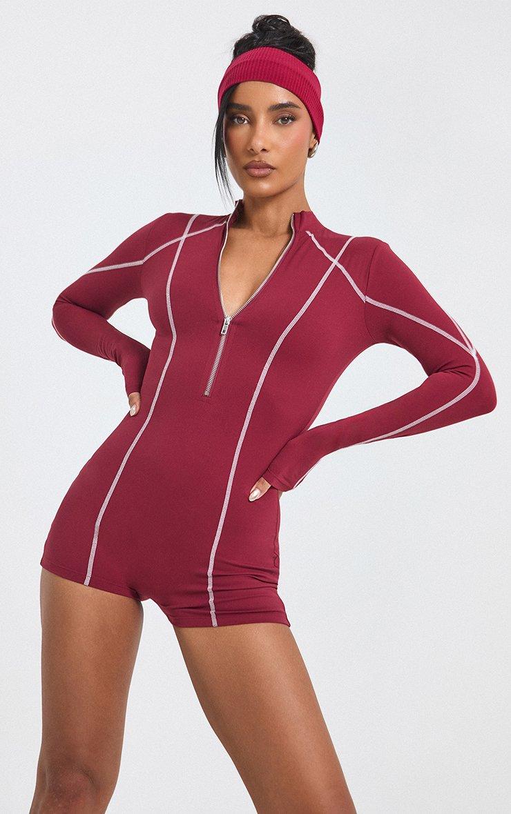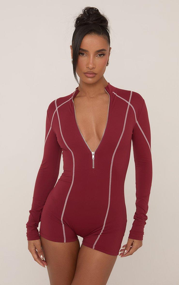Long Sleeve Half Zip Seam Detail Sculpt Playsuit In Burgundy
