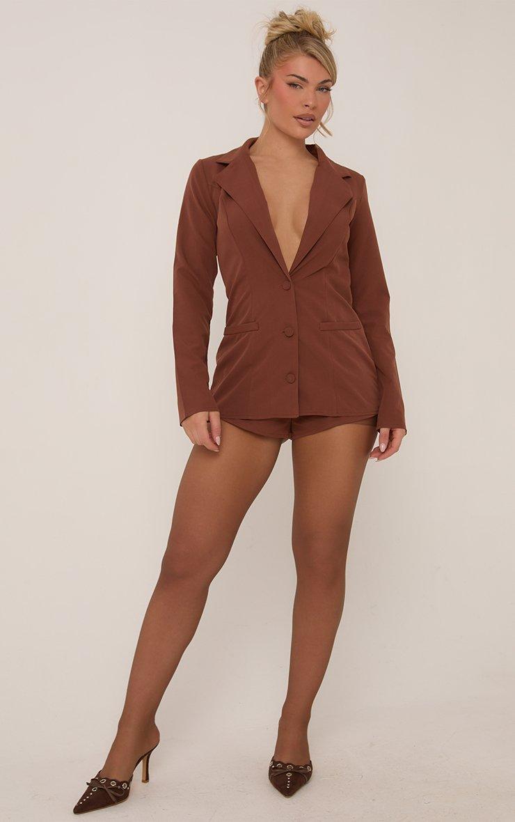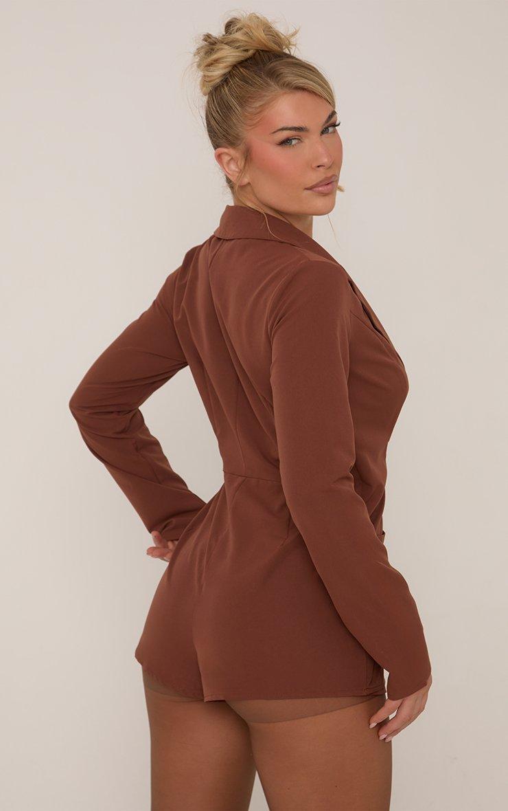 Plunge Neck Tailored Blazer Playsuit In Brown Woven