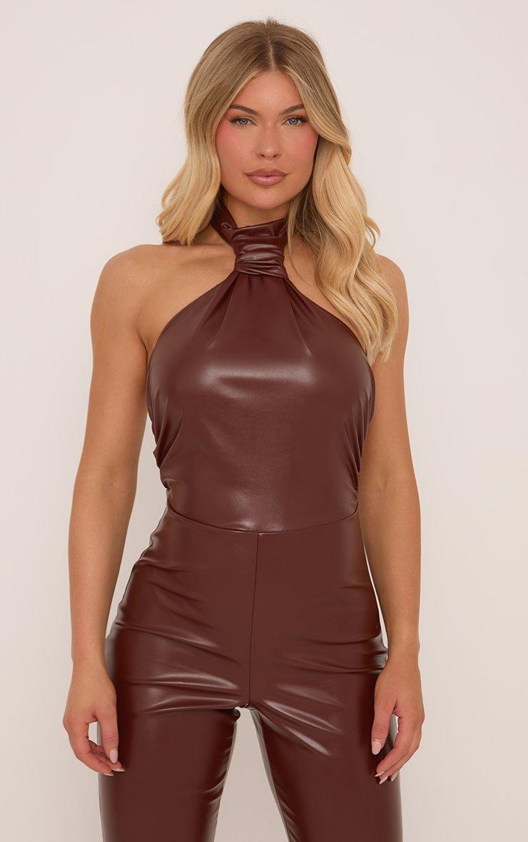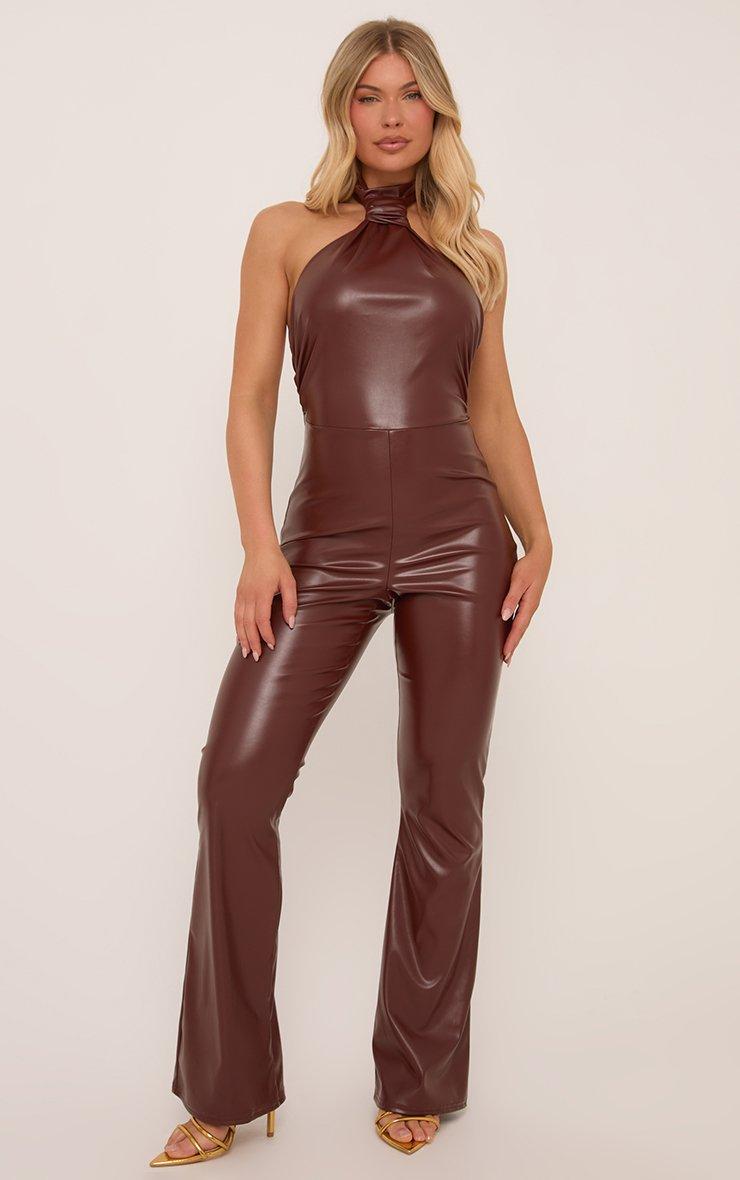 Halterneck Knot Detail Flared Leg Jumpsuit In Chocolate Brown Faux Leather