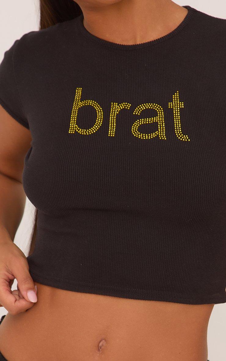 Go full brat autumn in our Short Sleeve Brat Diamante Crop Top In Black. This diamante crop t shirt boasts a sleek short sleeve, moody black tone and bold diamante brat slogan. Trust us, this crop top is just what you need for a bratty, unforgettable attitude!