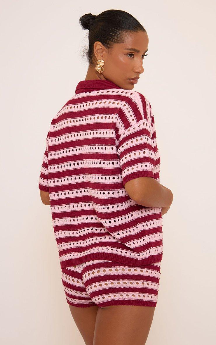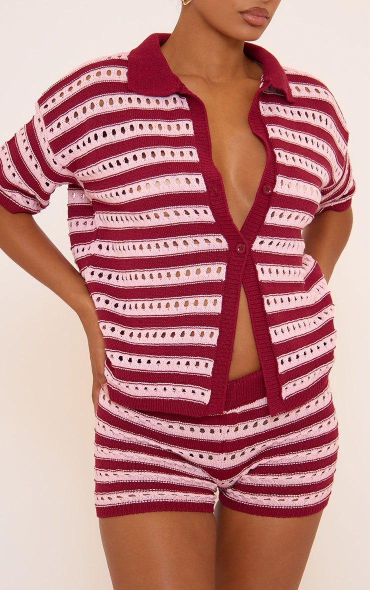 Low Rise Micro Shorts In Red And Pink Stripe Crochet Knit