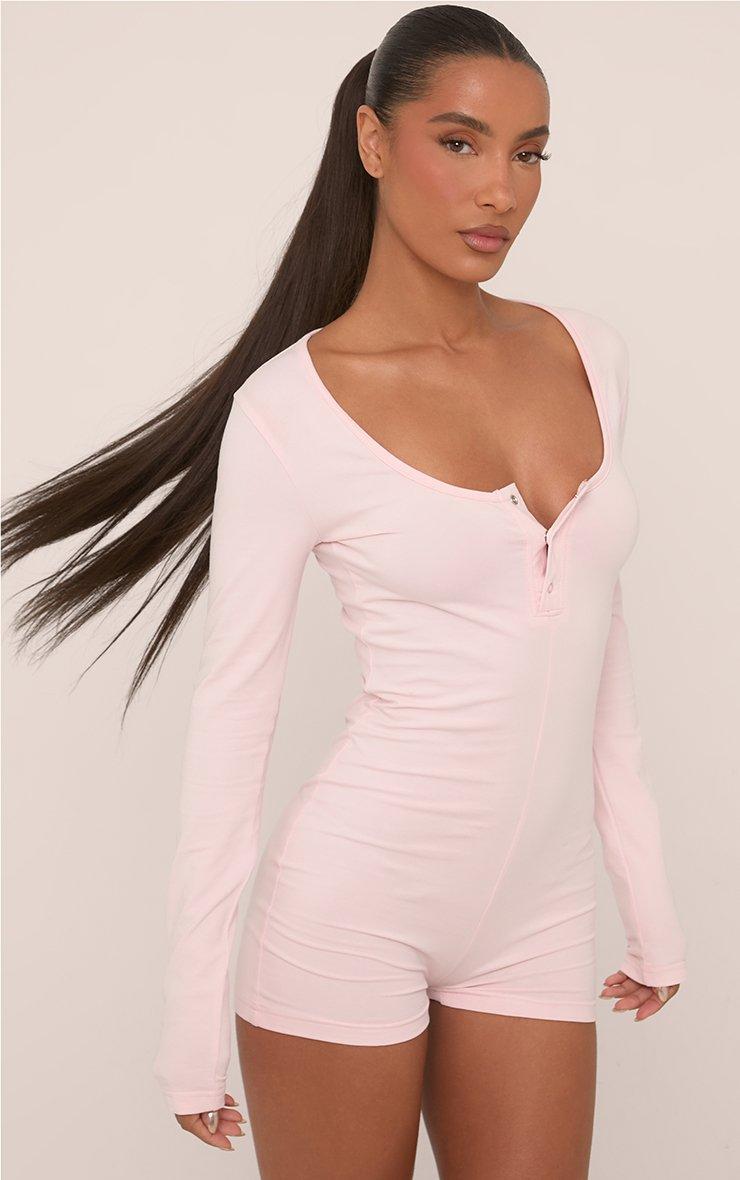 Get festive in our Long Sleeve Button Front Candy Cane Print Back Romper In Pink. This pink long sleeve romper cute and cosy with a classic button front style and candy cane print. Whether you're lounging or watching movies, you’ll be serving major holiday vibes in this romper.