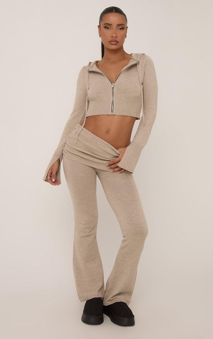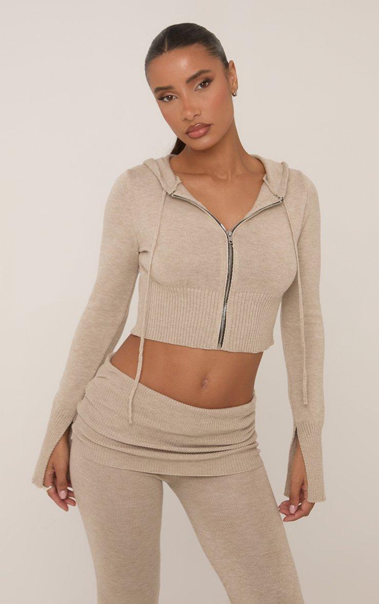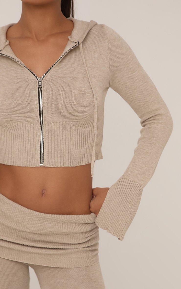 Long Sleeve Zip Up Drawstring Cropped Hoodie In Stone Knit