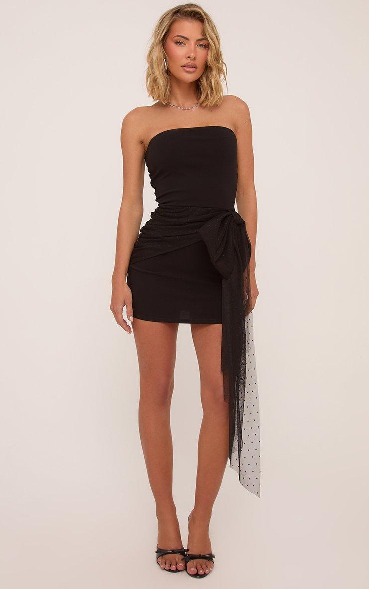 Bandeau Dobby Mesh Bow Detail Mini Bodycon Dress In Black