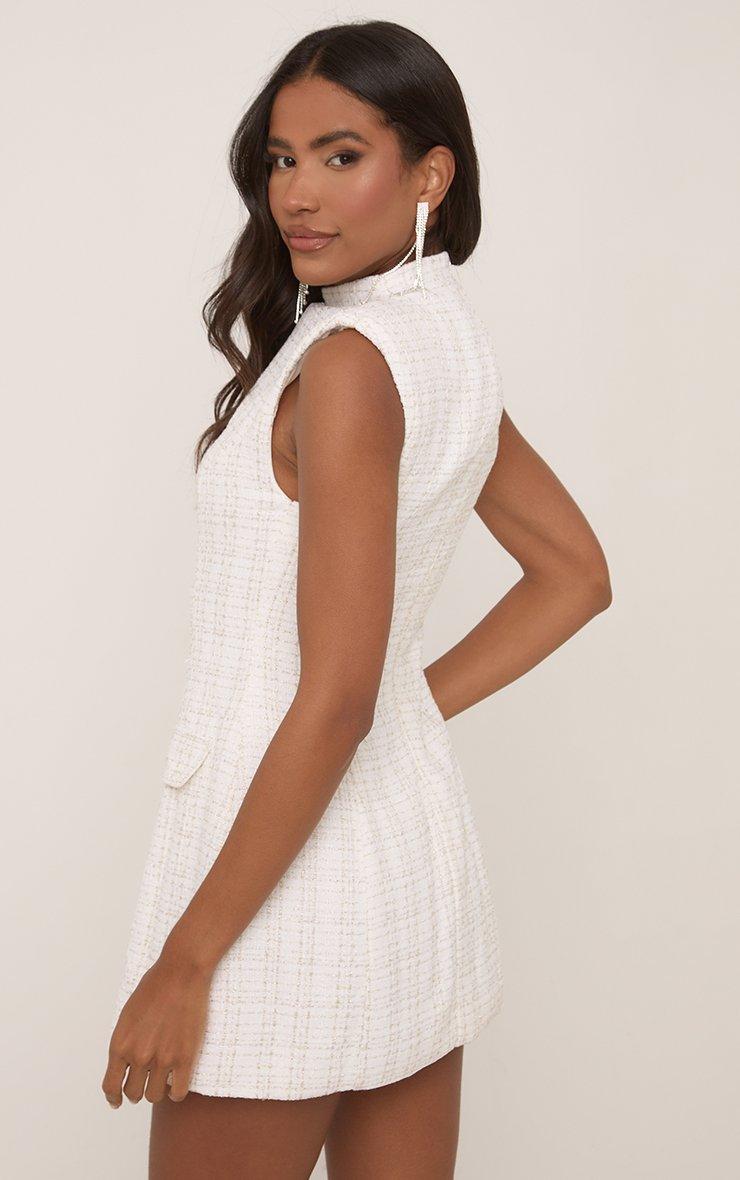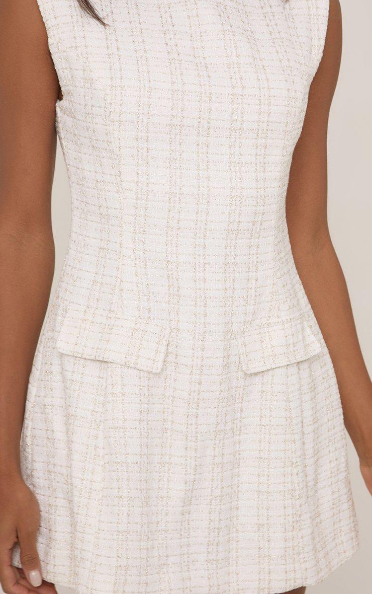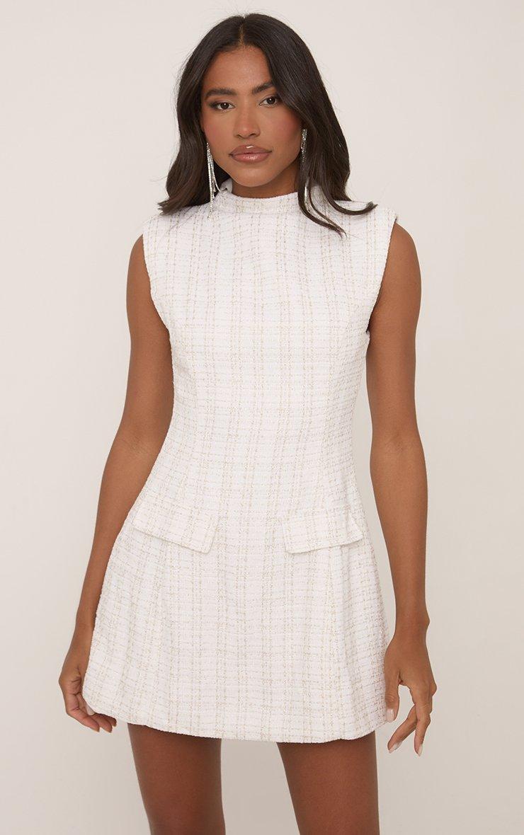 Make a statement, doll! Featuring a white boucle material with a high neck and pocket detailing, this A-line mini dress is all about effortless chic. Bold, clean, and ready to stand out.
