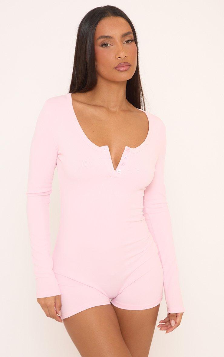 Perfect for cosy nights or relaxed mornings, pink soft fabric with long sleeves, scoop neck, and button-front detailing for a chic, on-trend pyjama romper fit. Style with slippers for effortless it-girl comfort.