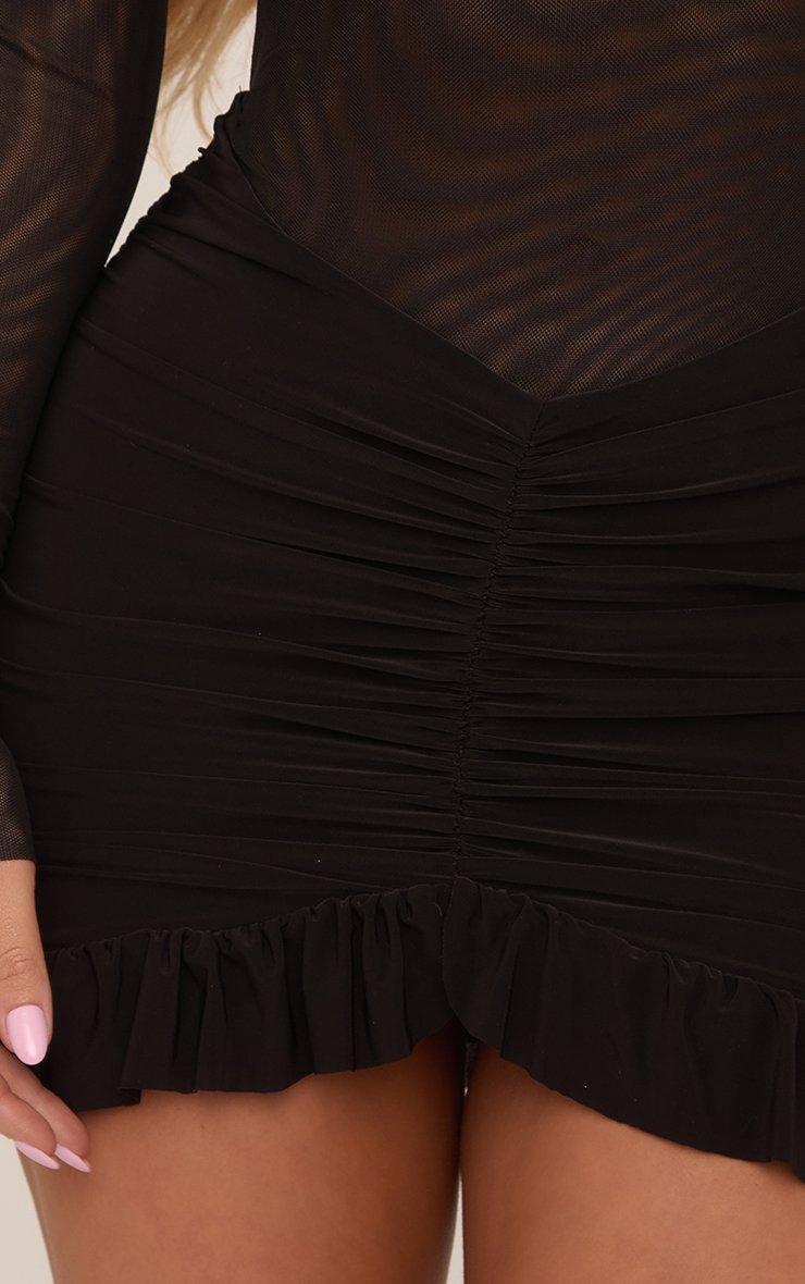 Long Sleeve Contrast Mesh Frill Hem Mini Dress In Black