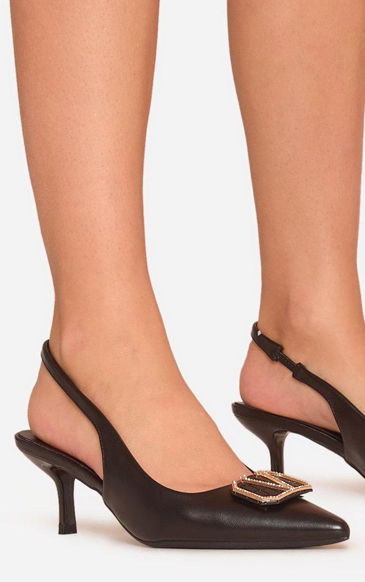 Steller Metal Detail Pointed Toe Slingback Court Heel In Black Faux Leather