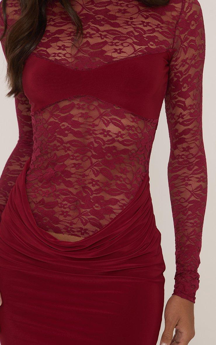Long Sleeve Cut Out Draped Front Mini Dress In Burgundy Lace
