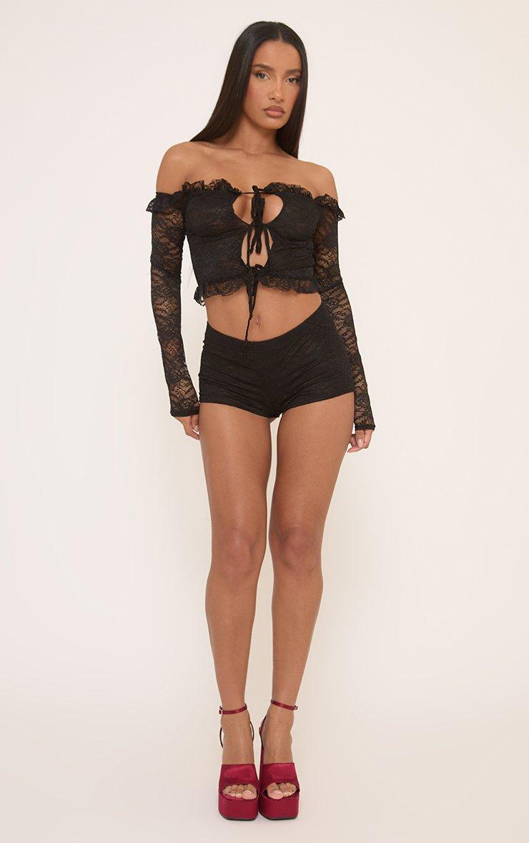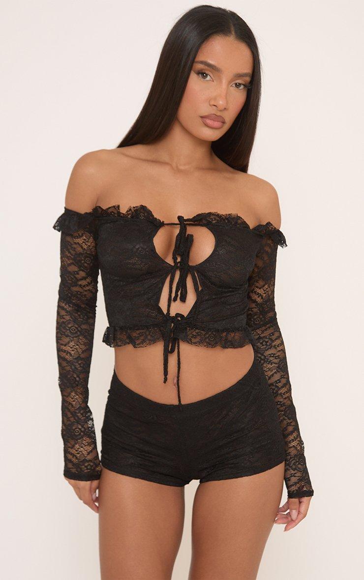 Long Sleeve Bardot Tie Front Crop Top In Black Lace