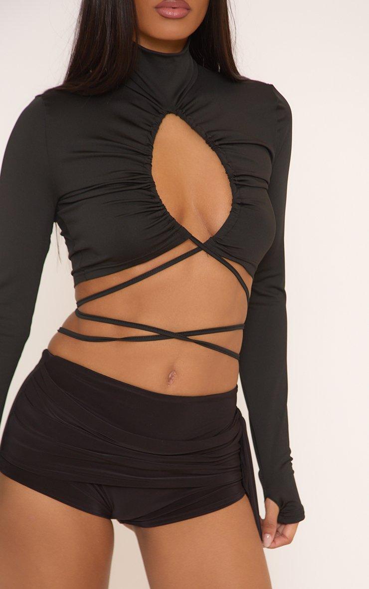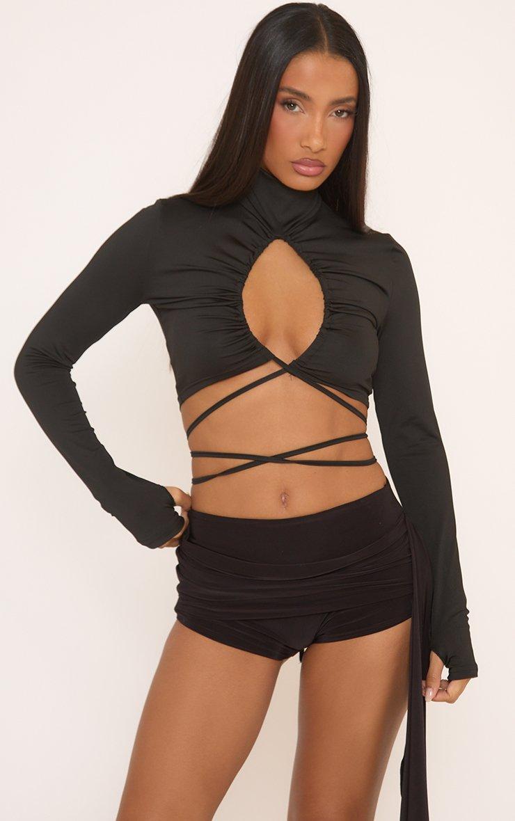 Long Sleeve Keyhole Cut Out Strappy Crop Top In Black Slinky