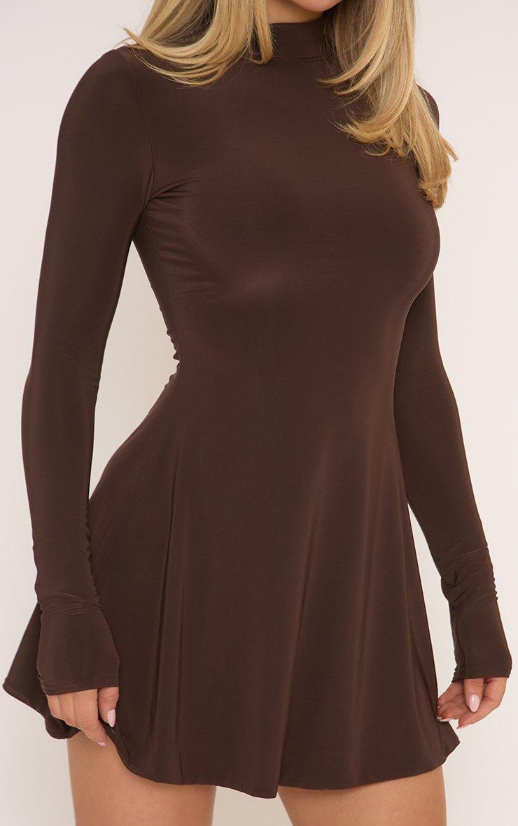 Long Sleeve High Neck Skater Hem Mini Dress In Brown