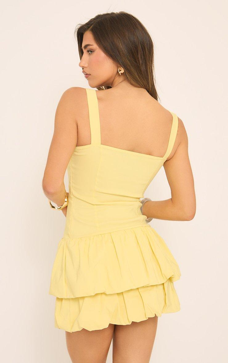 Make a statement, doll! Featuring a yellow fabric with a square neck and double puffball detailing, this mini dress is all about that playful, bold vibe. Perfect for a day out or casual date night.