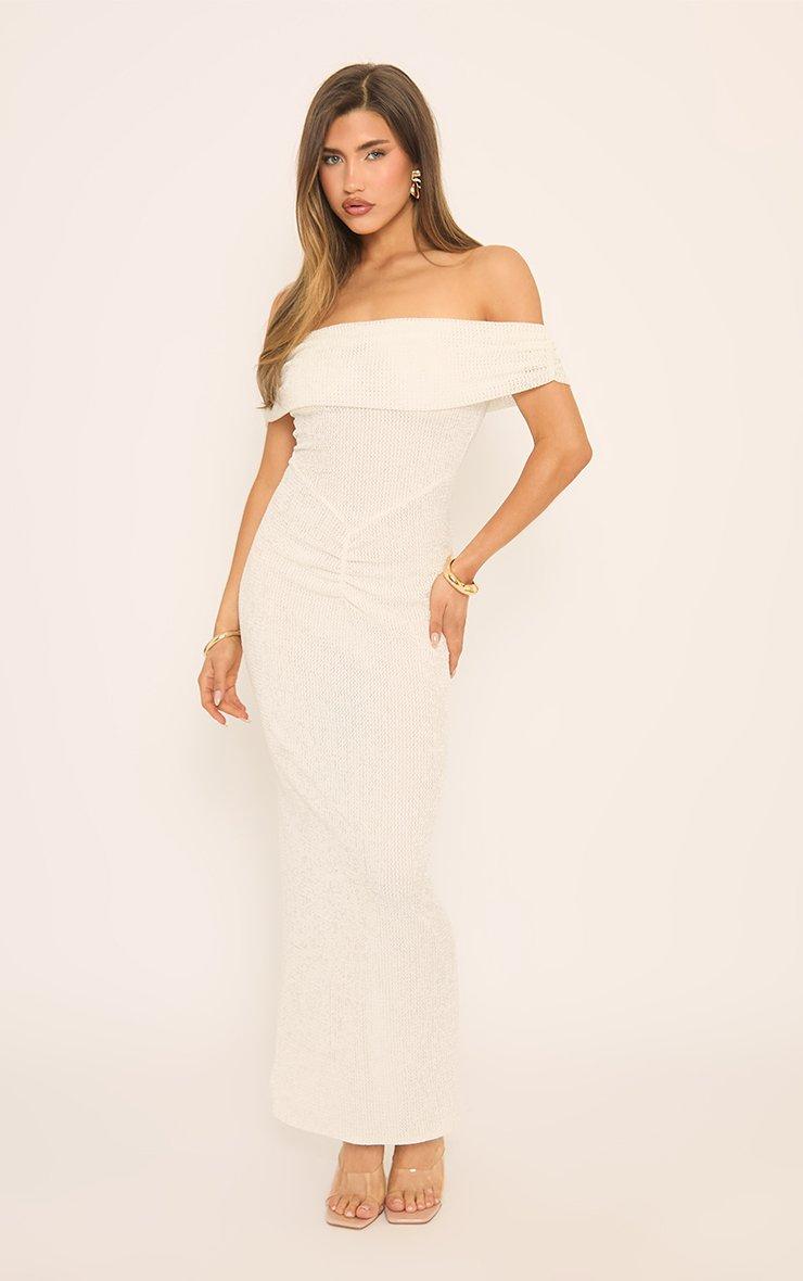 White textured fabric with a bardot neckline and ruched front detailing—this maxi dress is giving effortlessly glam, doll. One for summer nights where you wanna keep it chic but low-key luxe.