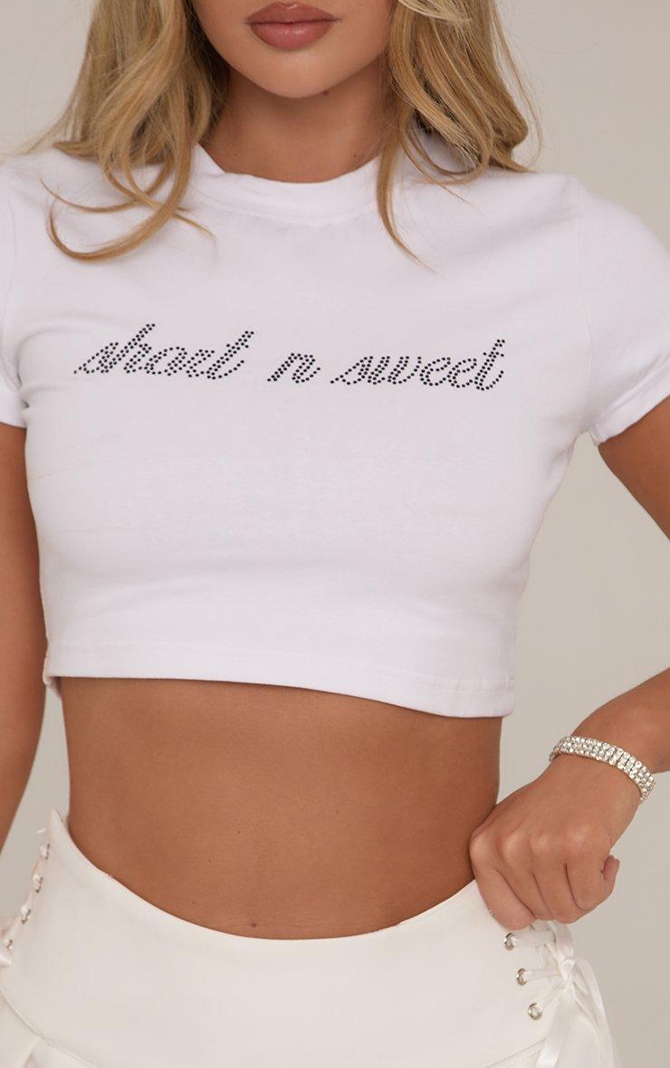 Short Sleeve Diamante 'Short N Sweet' Slogan Crop Top In White