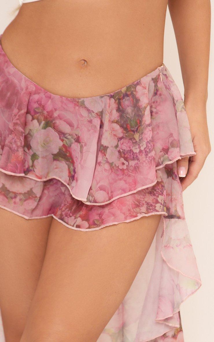 Mid Rise Ruffle Detail Draped Back Mini Skirt In Pink Floral Print