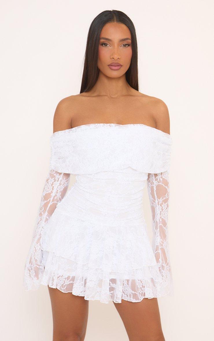 Long Sleeve Bardot Frill Hem Mini Dress In White Lace