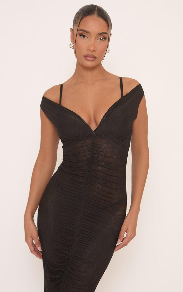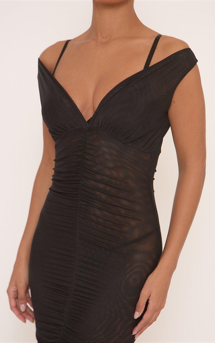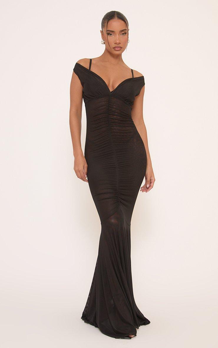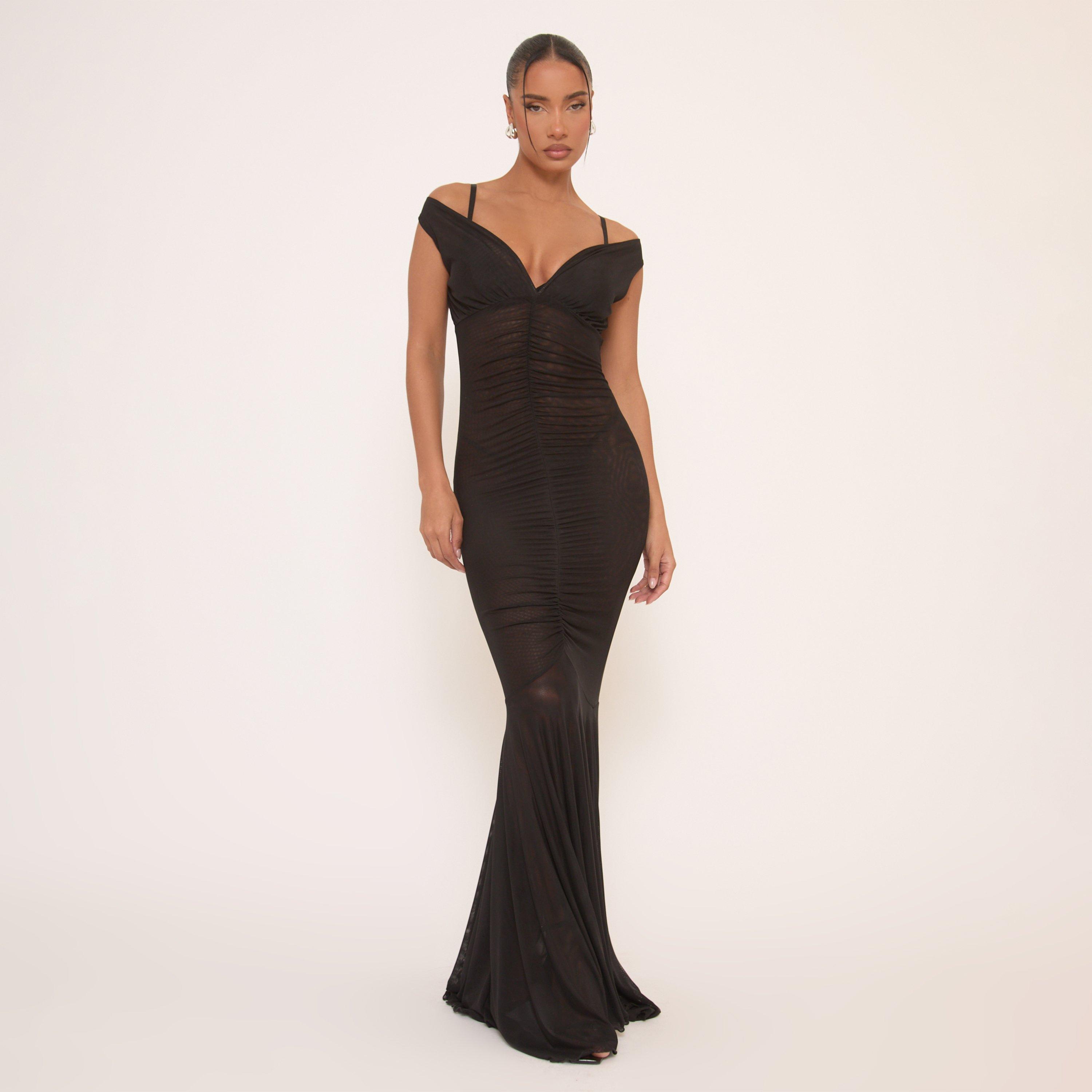 Turn heads, doll. Featuring a black fabric with a curved neckline, ruched detailing, and a fishtail hem, this maxi dress is all about sleek elegance and effortless style.