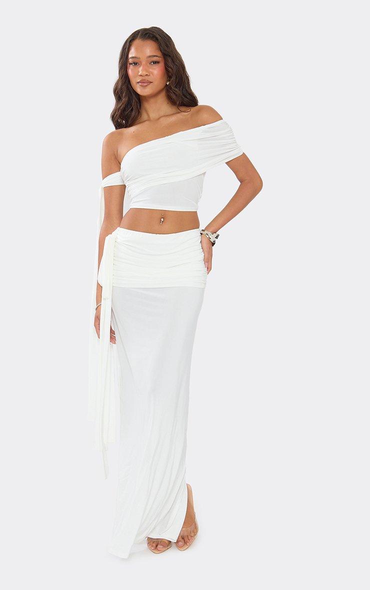 Perfect for your next summer brunch. Featuring cream slinky material with mid rise and ruched tie detailing. Team with a matching crop top and lace-up heels for a look we are obsessed with.
