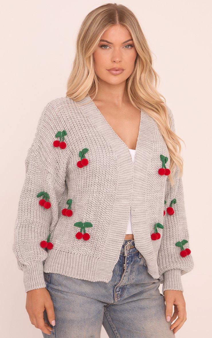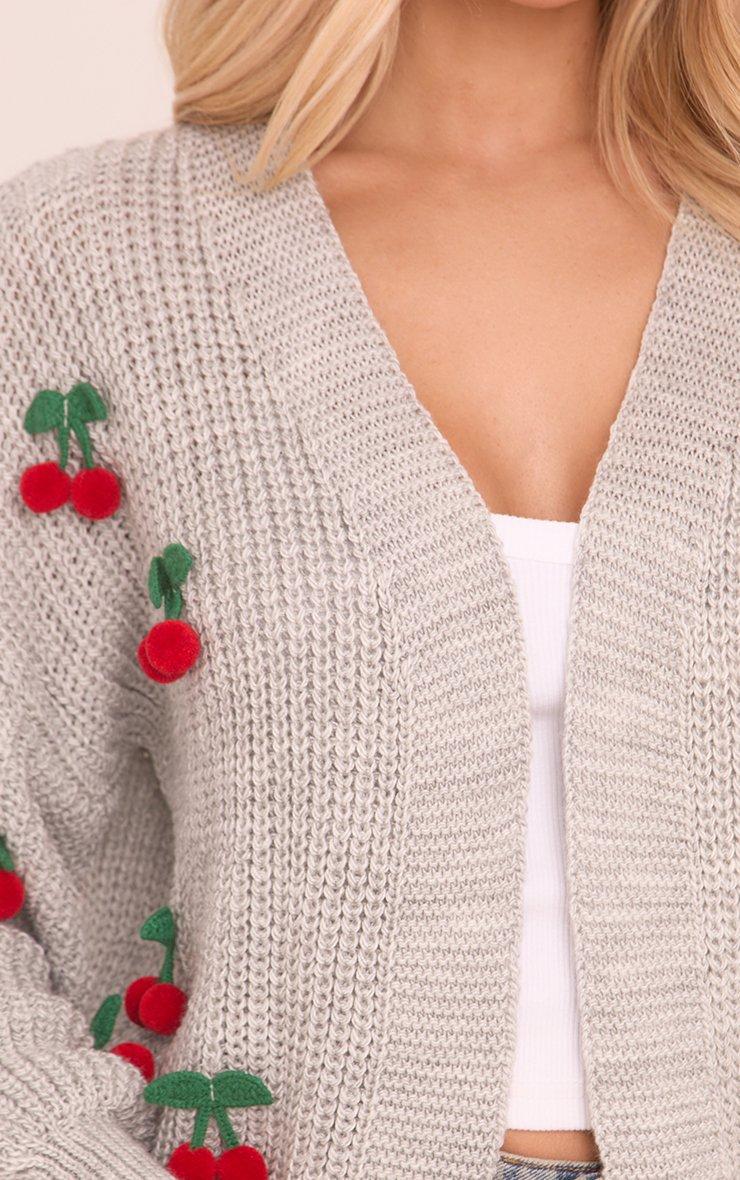 Balloon Sleeve 3D Cherry Print Cardigan In Grey Knit