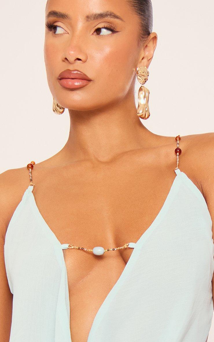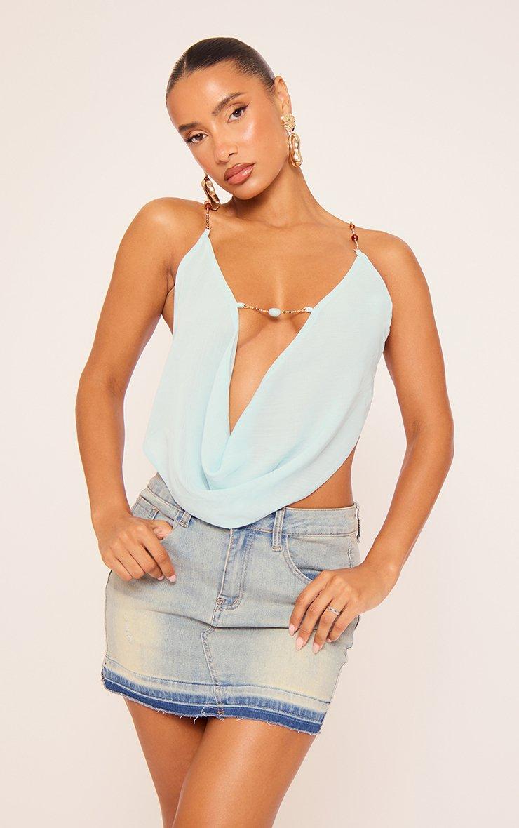 Perfect for that festival vibe or beach-to-bar moment, doll. Featuring a blue print mesh material with luxe beaded strap detailing, this cowl halterneck top is your new statement staple.