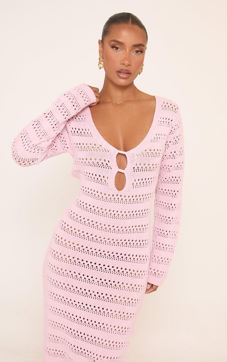 Long Sleeve Plunge Keyhole Detail Maxi Dress In Pink Crochet Knit