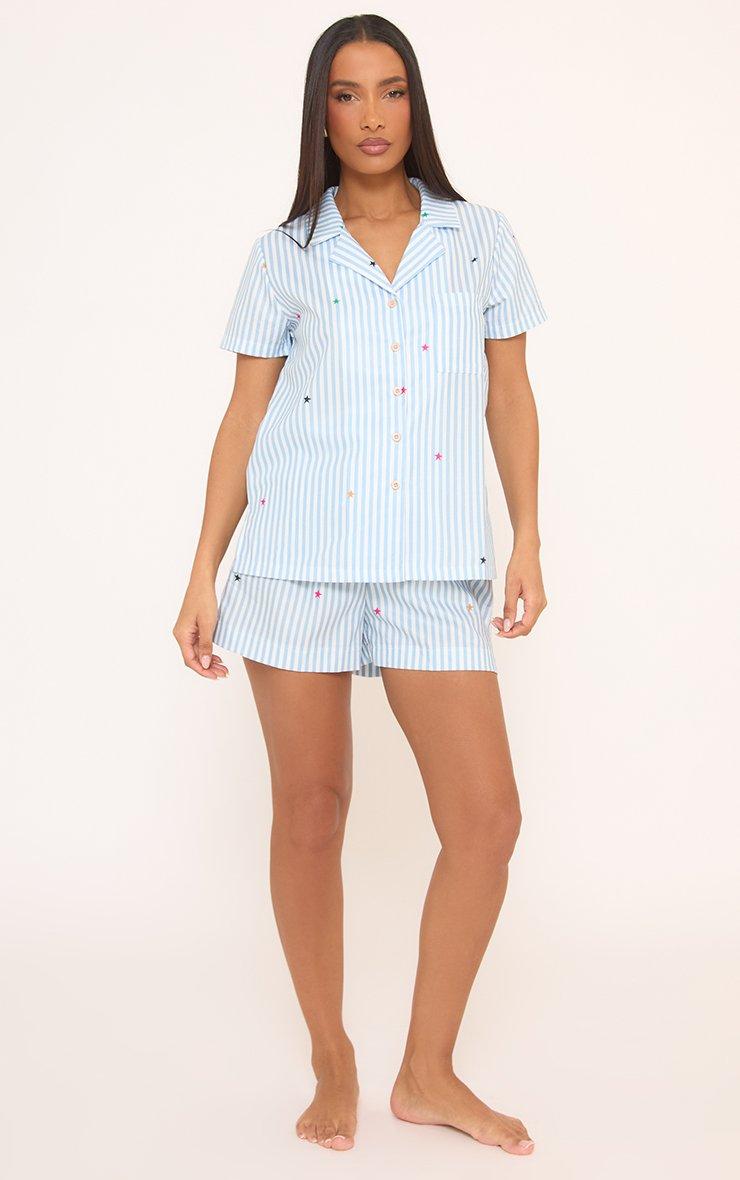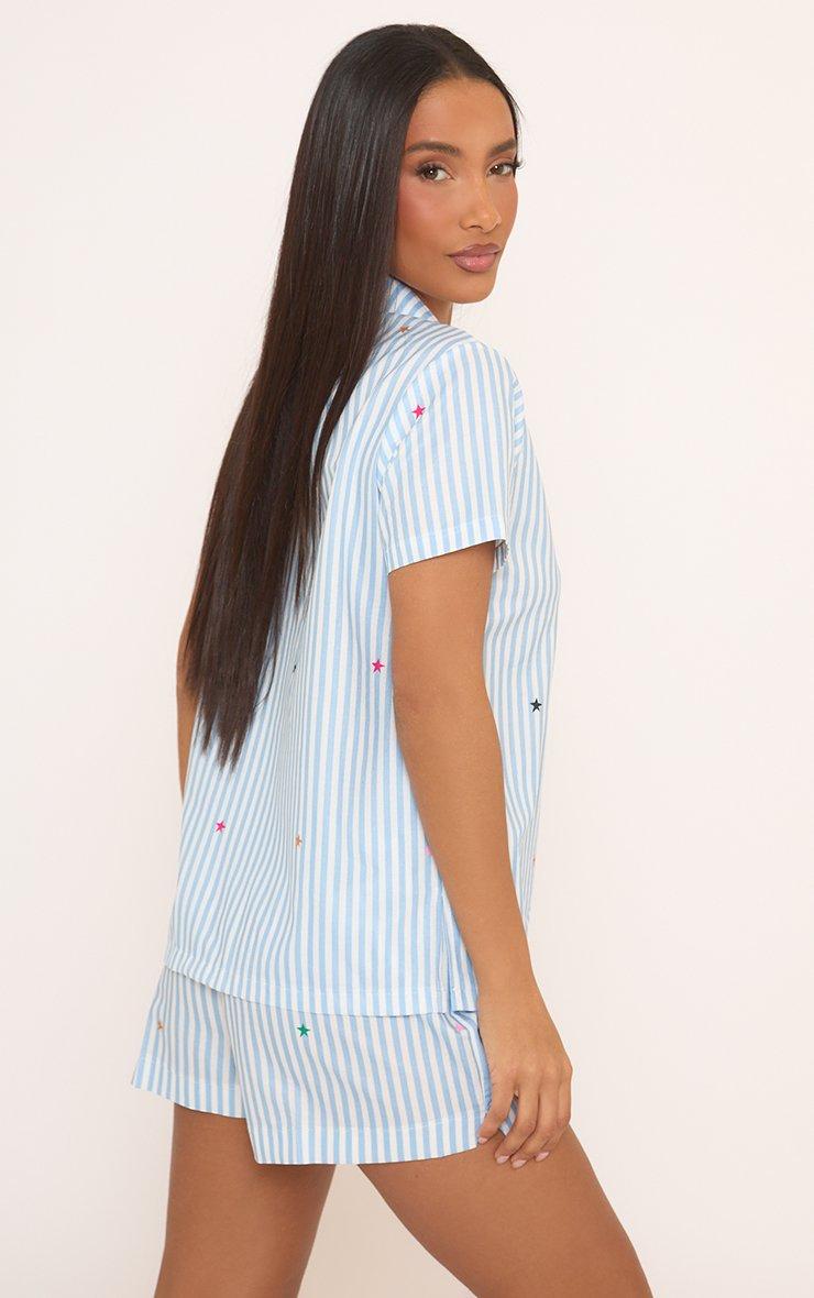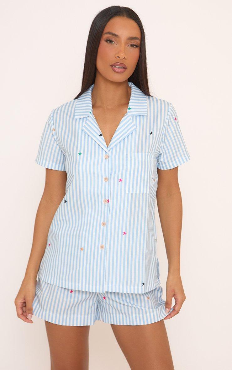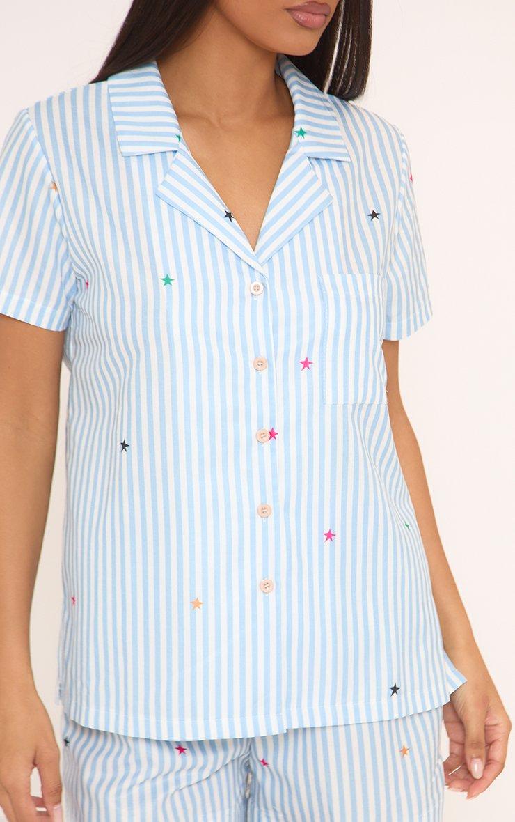 Short Sleeve Button Front Shirt And Shorts Pyjama Set In Blue Striped Star Print