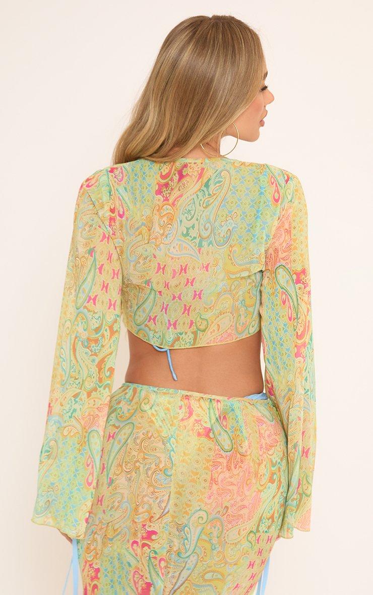45764 Paisley Printed Contrast Tie Front Flared Sleeve Crop Top In Multi