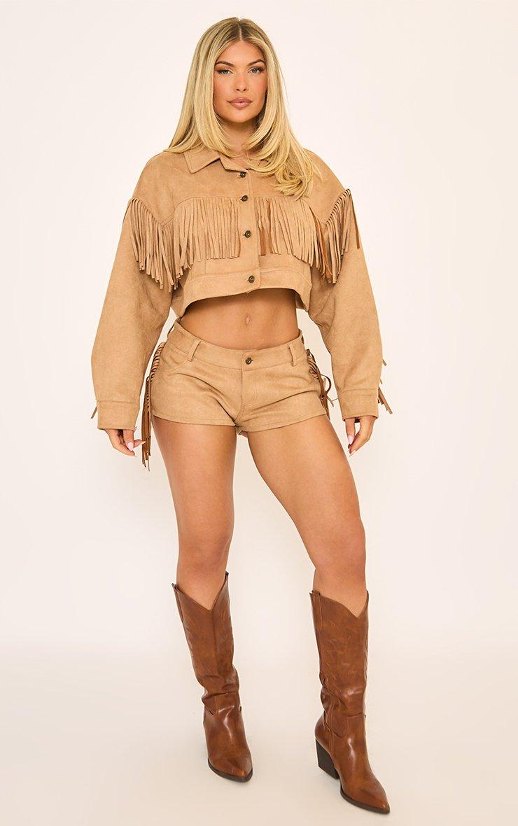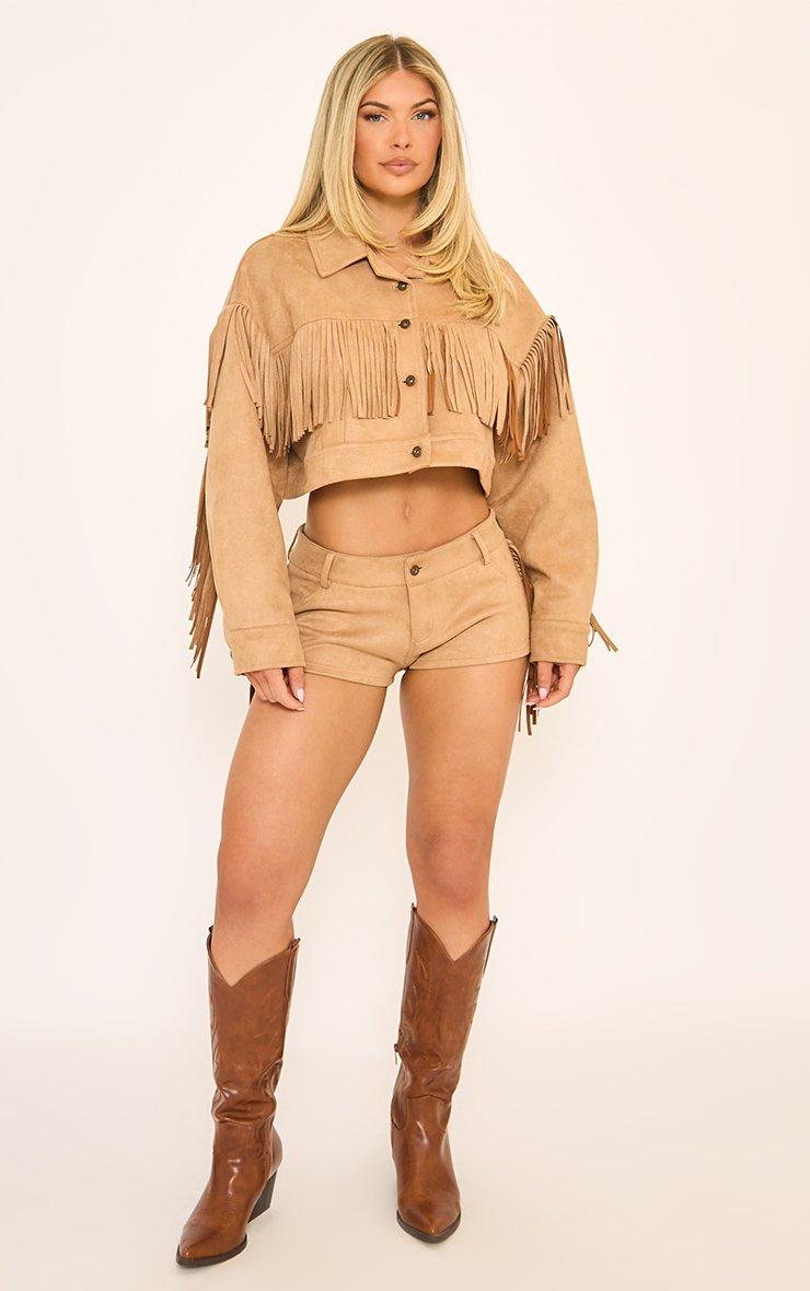 Low Rise Fringe Detail Shorts In Tan Faux Suede