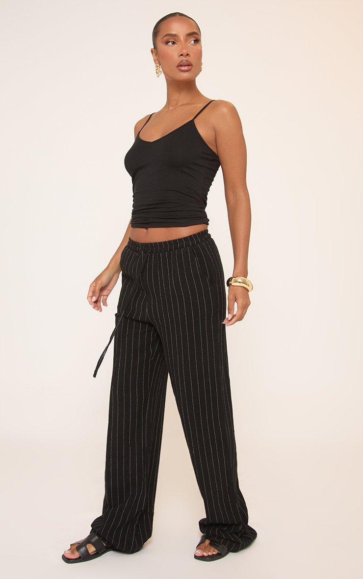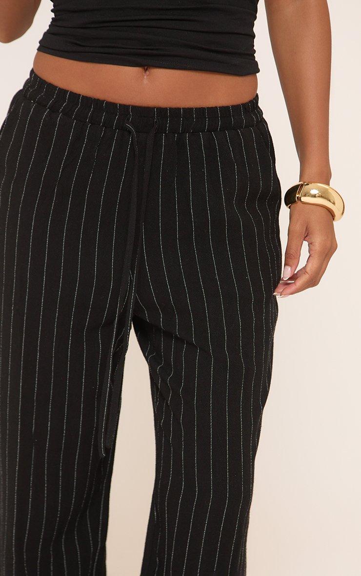 For effortless sophistication, doll. Featuring black striped linen with a mid-rise fit and straight-leg cut, these trousers add a touch of classic elegance with a modern twist for every occasion.