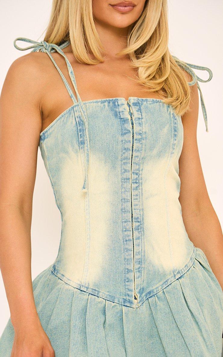 Square Neck Hook And Eye Drop Waist Mini Dress In Blue Wash Denim