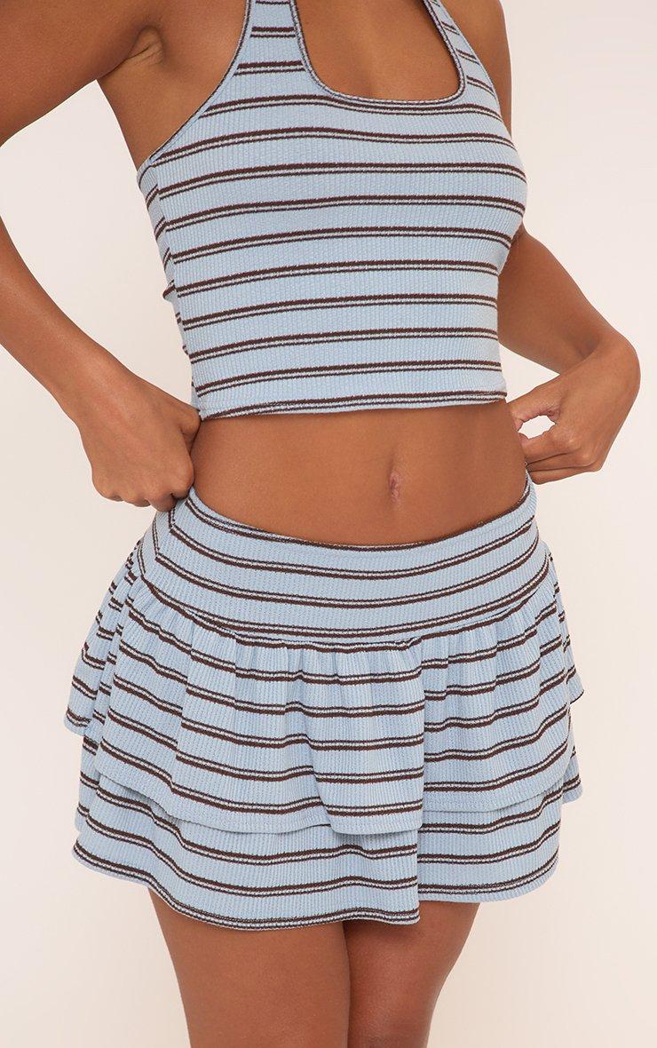 Mid Rise Tiered Frill Mini Skirt In Blue And Brown Stripe