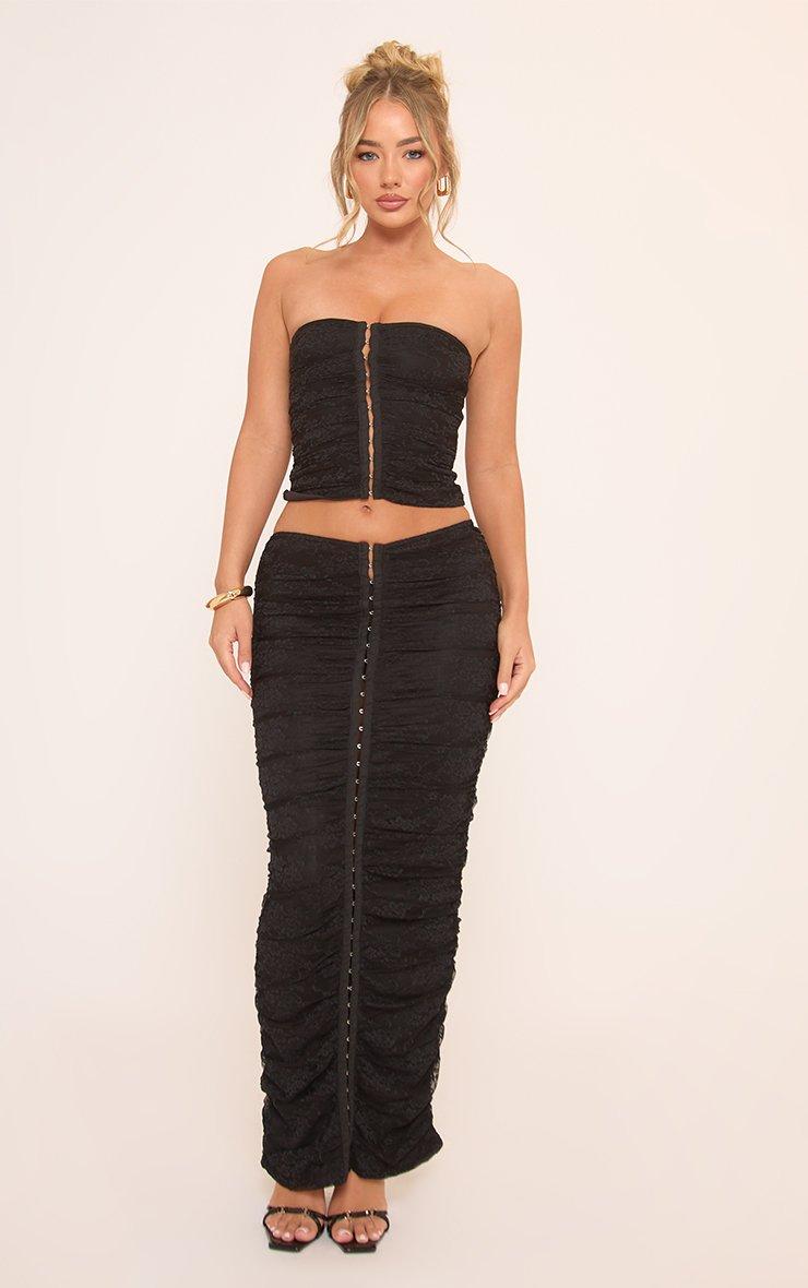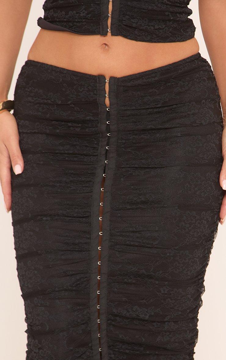 Bring that after-dark attitude with our Low Rise Hook And Eye Detail Maxi Skirt In Black Lace. Featuring a low-rise fit and hook and eye detailing, this black lace maxi skirtâ is serving fierce, flirty energy. Pair this black lace maxi skirtâ with the matching top for a glam edge.
