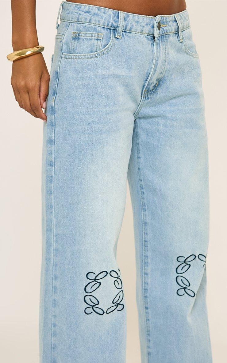 Low Rise Embroidered Swirl Detail Straight Leg Jeans In Blue Denim