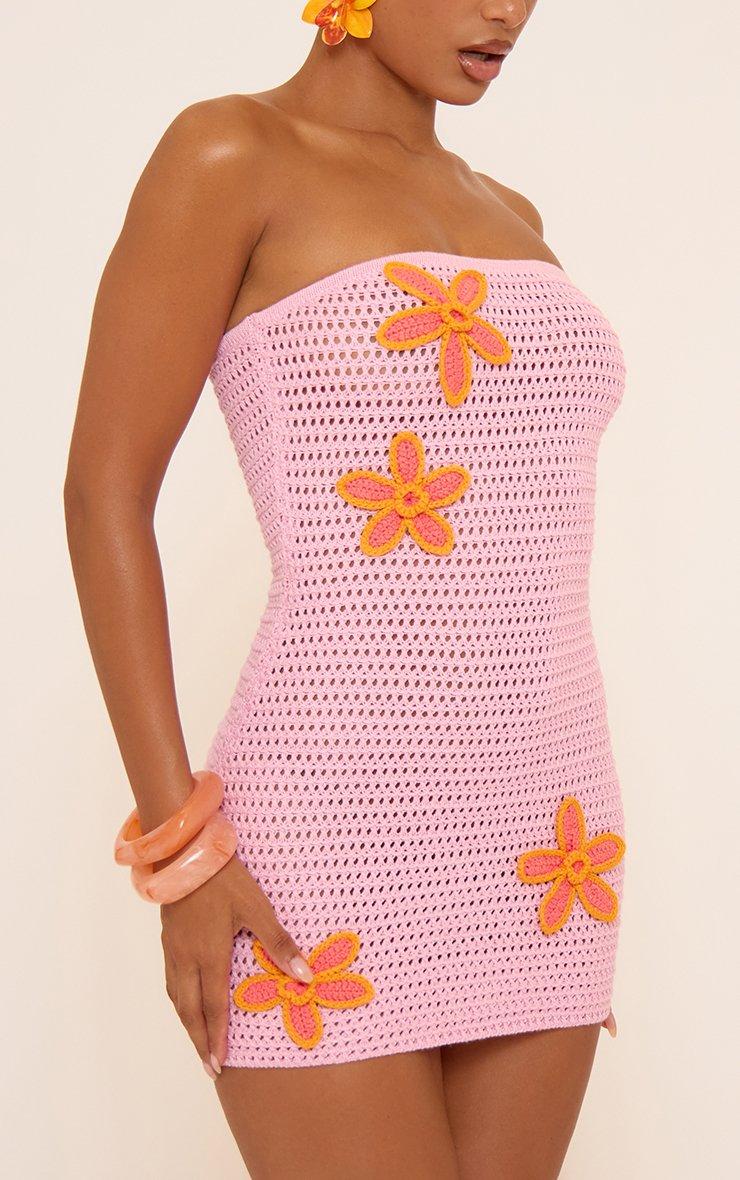 Bandeau Floral Applique Detail Mini Dress In Pink Crochet Knit