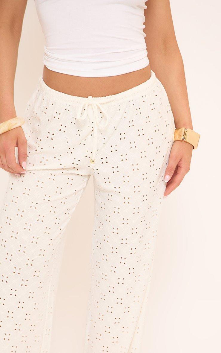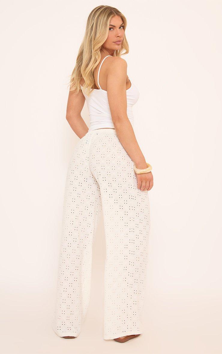 Mid Rise Tie Waist Detail Wide Leg Trousers In White Broderie